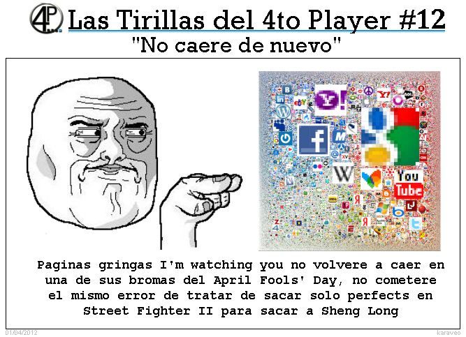 Gentecita recuerden que hoy es el April Fool’s Days de los gringos (su equivalente a nuestros días de los inocentes) así que cuidado con lo que vean en internet recuerden solo hacerle caso a las noticias sexys de acción del 4to Player y sin más preámbulo ahí les van las tirillas de esta semana: