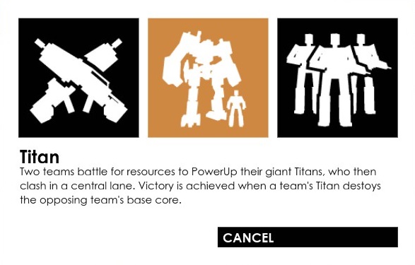 El modo «Titan» es bastante interesante ya que al igual que el modo «Team Death Match» también será una lucha entre dos equipos pero aquí contaremos con ayuda de un «Titan» un enorme robot con el que podremos hacerle frente al «Titan» enemigo y tratar de destruir una especie de orbe de energía en la base enemiga mientras tratamos de proteger nuestra base (el tutorial del juego nos explica bien esta parte no se preocupen si les quedaron dudas).