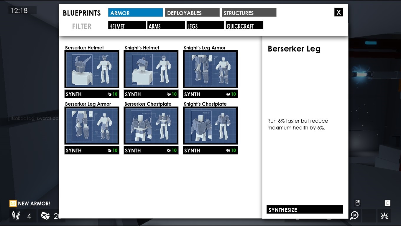 Algo muy importante es que en todo modo de juego podremos ir «sintetizando» nuestro equipo al hallar ciertos ítems ya que empezamos sin nada encima pero podremos equiparnos al vuelo ya sea para obtener más energía, tener más velocidad, etc. lo que nos dará ventaja en el juego aunque hay que tener en cuenta que al hacer esto puede afectar algún otro stat (por ejemplo hay unas botas que te hacen mas rápido pero te restan tu cantidad de energía total).