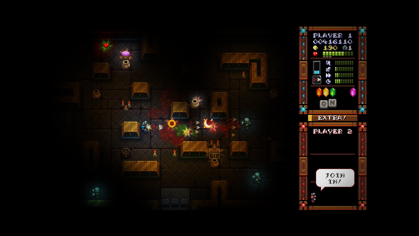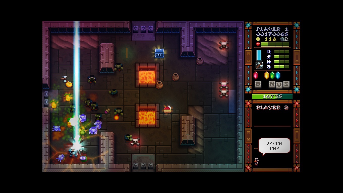 Después de un muy breve intro donde vemos como un monstruo se lleva toda nuestra preciada comida nos vamos directo a la acción siendo un juego con un control bastante accesible al pertenecer al género de los «Twin-stick shooters» con el que seguro se sentirán identificados jugadores de la «vieja escuela » (por no decir jugadores viejitos) al estilo de Robotron: 2048 o Smash TV (o si son de «nueva escuela» algo por el estilo de Dead Nation) donde iremos recorriendo cuarto tras cuarto lleno de enemigos teniendo la libertad de movernos y disparar de forma independiente.