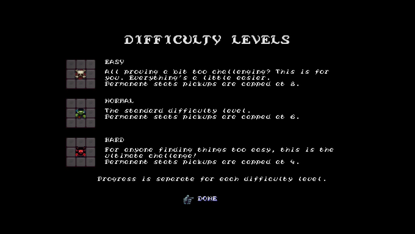 El juego en si es muy corto en teoría si no mueres te tomaría alrededor de una hora terminar los cuatro pisos pero esto seguro no pasara ya que al morir (que pasara mucho) eres regresado al principio del piso donde te quedaste perdiendo los powerups y monedas que habías obtenido en el transcurso de esa partida (a menos que te hayas gastado tus monedas en power ups permanentes) cosa que puede frustrar un poco sobre todo si estabas cerca de terminar un piso pero le ayuda mucho tener tres niveles de dificultad (con sus progresos salvados independientemente) que nos permiten jugar a nuestro propio ritmo (este es otro de los agregados del nuevo parche).