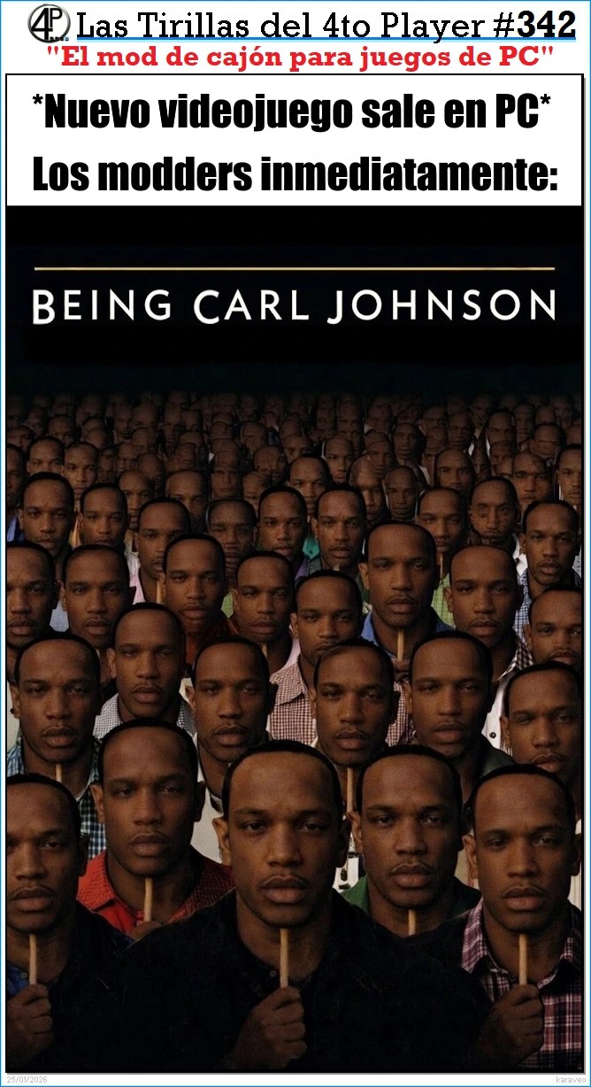Filosofar por la vida gamer nos dio inspiración para la tirilla dedicada a Carl «CJ» Johnson de Grand Theft Auto: San Andreas. Los cinéfilos captaran inmediatamente la referencia a la película Being John Malkovich, aunque seguramente cualquier jugador igualmente captará la broma al ser uno de los mods gráficos más populares dentro del mundo de los videojuegos de PC (sin contar los mods NSFW).